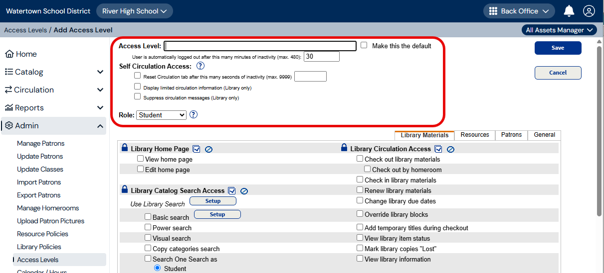 3. In the Access Level field, type a name, such as Self-Checkout, Self-Checkin, or Self-Circulation.